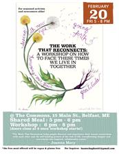 The Work That Reconnects is a meeting that invites the community in to bring their fears, loves, grief, and joy into political action. There will be a FREE shared meal from 5-6 PM (vegan & gluten-free), followed by the workshop 6-8 PM. (Doors will close at 6 PM once the workshop starts)!